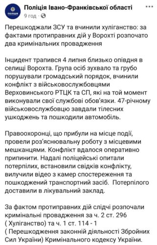 05.07.2024 - 11:42The National Police of Ukraine has opened two criminal cases related to the conflict between residents of Vorokhta and representatives of the territorial recruitment center: one for obstructing the work of the Armed Forces of Ukraine and another for hooliganism.