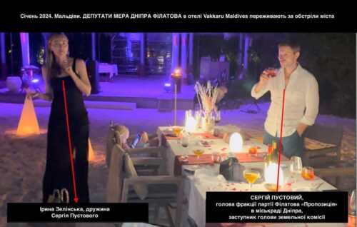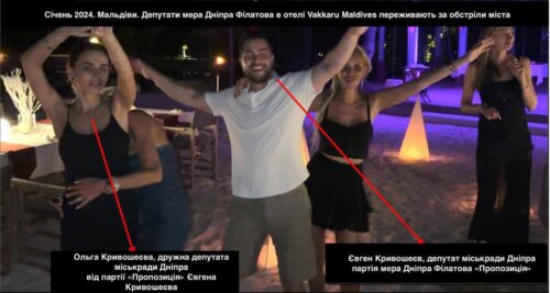 The video shows Serhiy Pustovoy, head of Filatov’s faction, and his wife. Pustovoy is responsible for land issues in the city council. Also present is deputy Yevhen Krivosheev with his wife Olga, who was wearing jewelry worth over €50,000, including pieces from Van Cleef and Cartier. These are likely gifts from her husband, who also deals with land and construction issues.