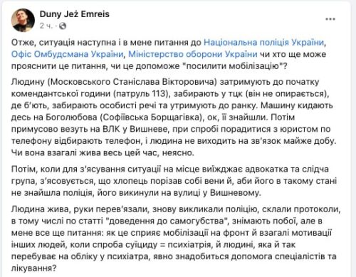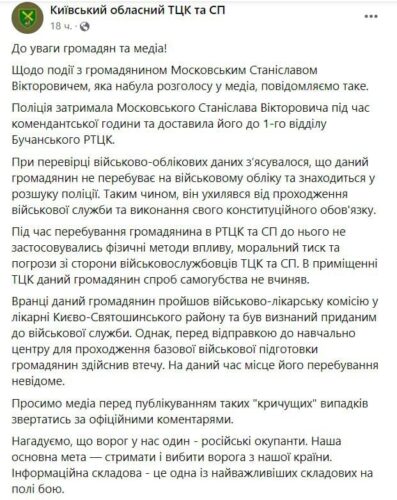 Утверждается, что военнообязанного гражданина Украины Станислава Московского до начала комендантского часа задержал патруль. Далее мужчину забрали в территориальный центр комплектования, сопротивления этому он не оказывал. Там его, по словам знакомых, избили, забрали личные вещи и удерживали до утра. Его автомобиль остался брошенным на Софиевской Борщаговке.