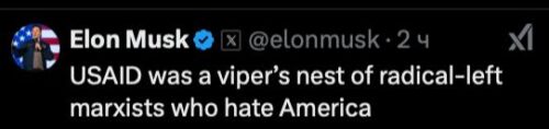 Комментируя это, Маск заявил, что USAID – "змеиное гнездо леворадикальных марксистов, которые ненавидят Америку", и добавил, что оно "должно умереть".