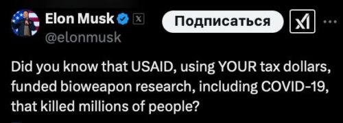 "Знаете ли вы, что USAID, используя ВАШИ налоговые деньги, финансировало исследования биологического оружия, включая COVID-19, в результате которых погибли миллионы людей?" – написал Маск.