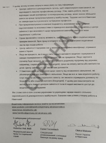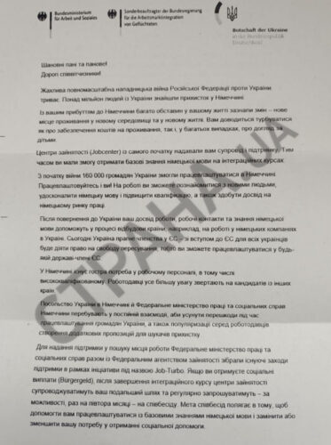 It also states that the skills acquired by Ukrainians can be applied upon their return home – for example, by working for German companies in Ukraine or in other EU countries. The rest of the letter provides recommendations on how to find employment in Germany.