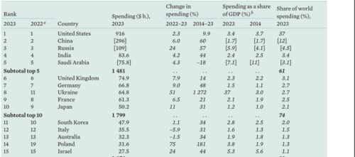 About half of the world’s military spending last year was accounted for by the United States and China. All countries in the top 10 increased their military expenditures.